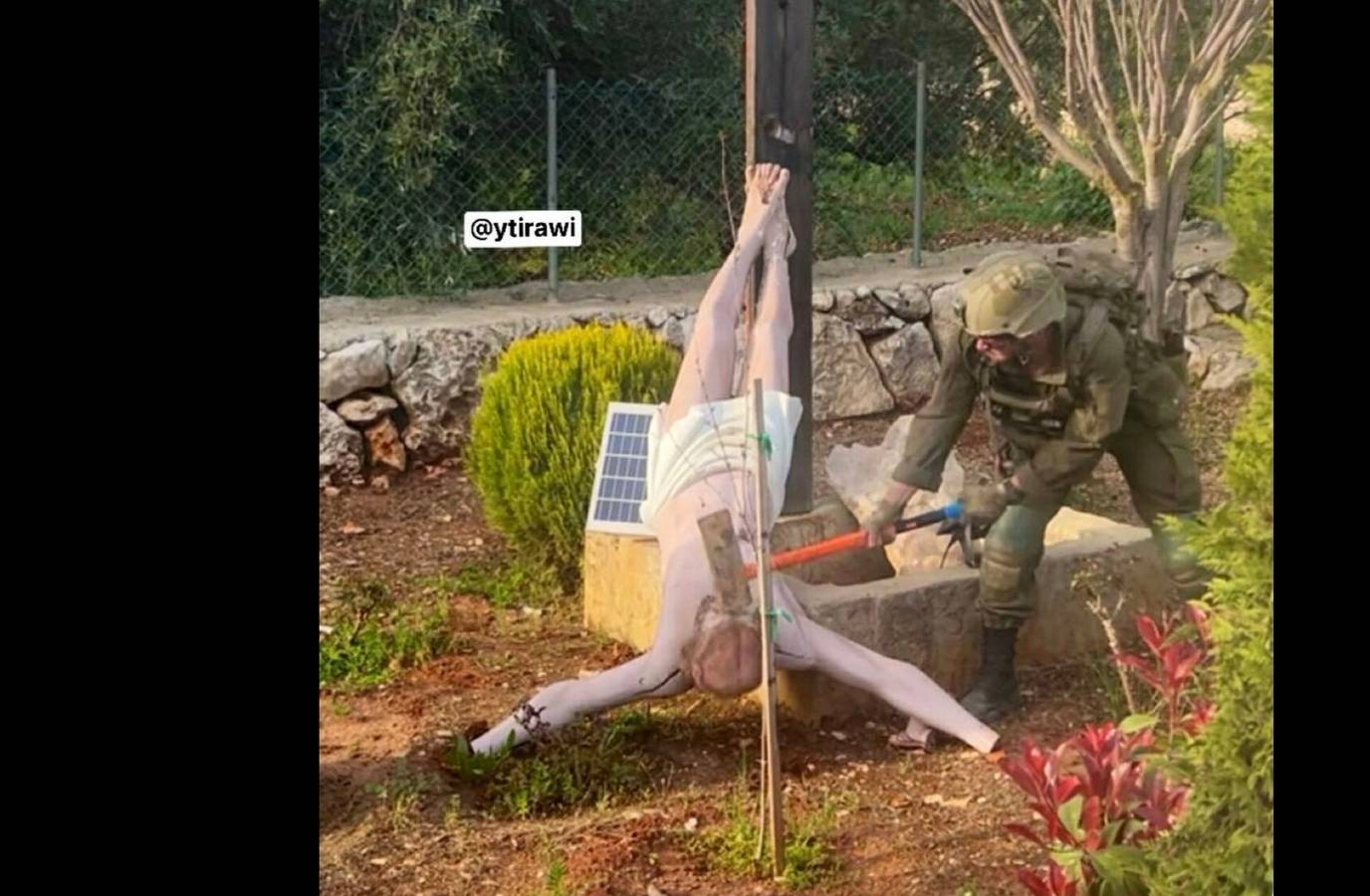 Images circulating online showed the soldier striking a sculpture of Jesus with a hammer and damaging the face of the statue.